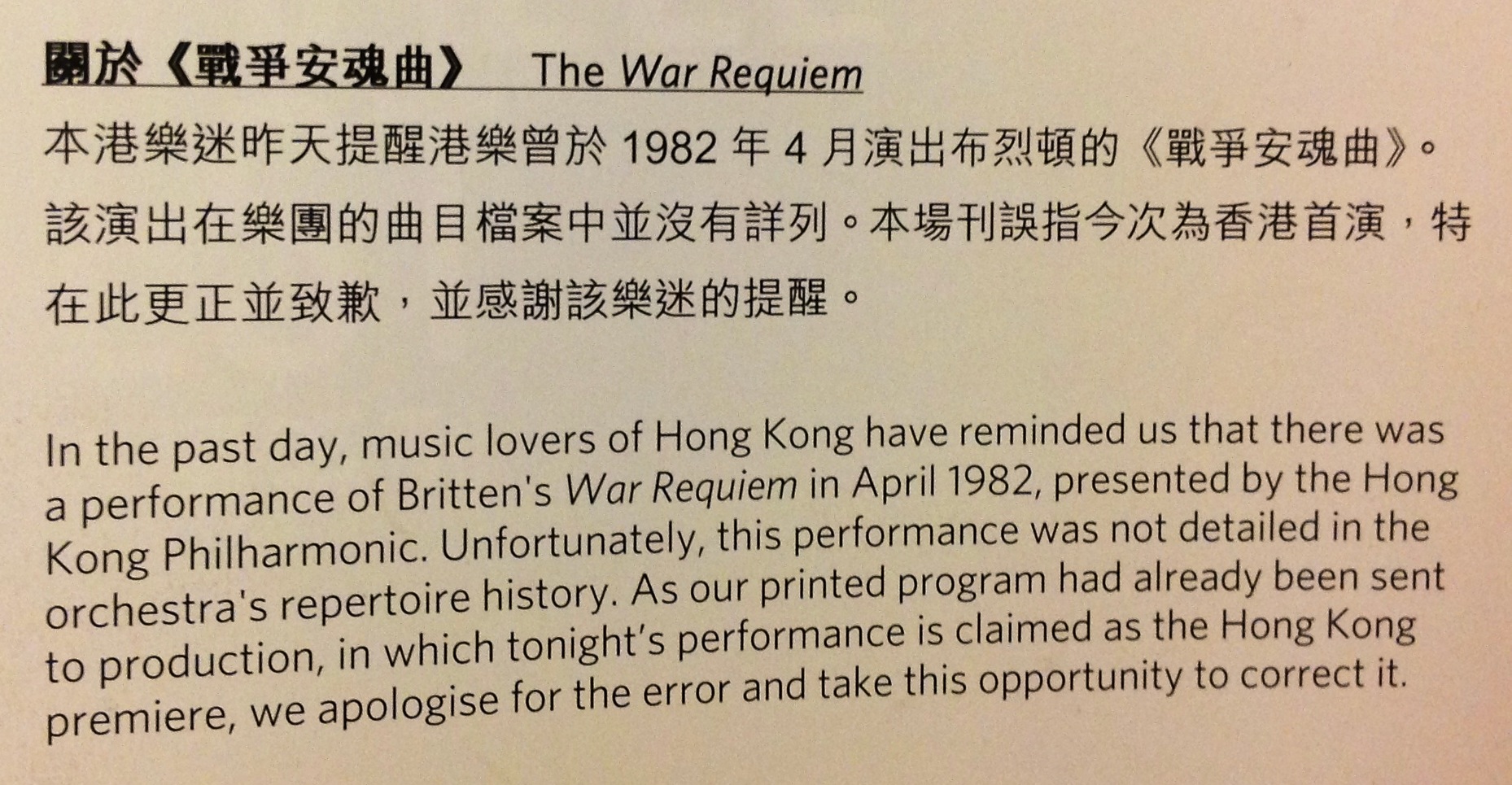 港樂《戰爭安魂曲》音樂會終於在星期四晚舉行,大家關心的場刊「烏龍首演」也得到圓滿解決:儘管已付印的場刊未能及時改正,樂團特別印製臨時通告夾附每份場刊,足見誠意!