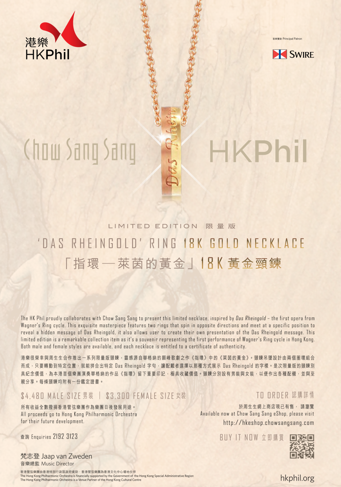周生生這次是音樂會的「指環贊助」,好一個絕配的冠名贊助拍檔!於是乎廣告必不可少,一看廣告,更發現有周邊商品,所有販賣收入撥歸樂團發展之用,正想讚嘆樂團與贊助商合作的手法愈見高明及深入時,再看清楚⋯⋯甚麼?指環頸鏈?