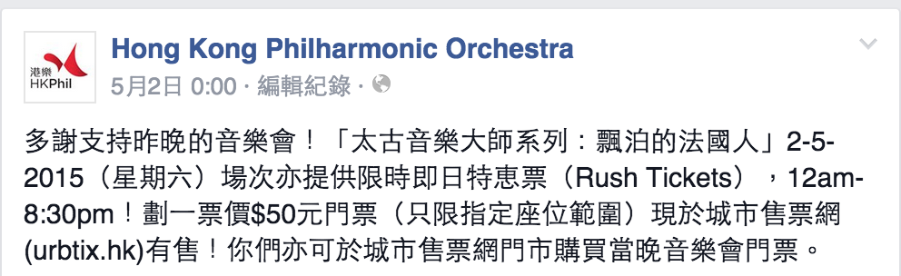 時間回到今天,港樂這個只在Facebook公佈的$50特惠票優惠是否能吸引到更多觀眾?或許可以。但身邊兩位朋友在有了特惠票後的經歷,卻足見這計畫仍有改善空間。
