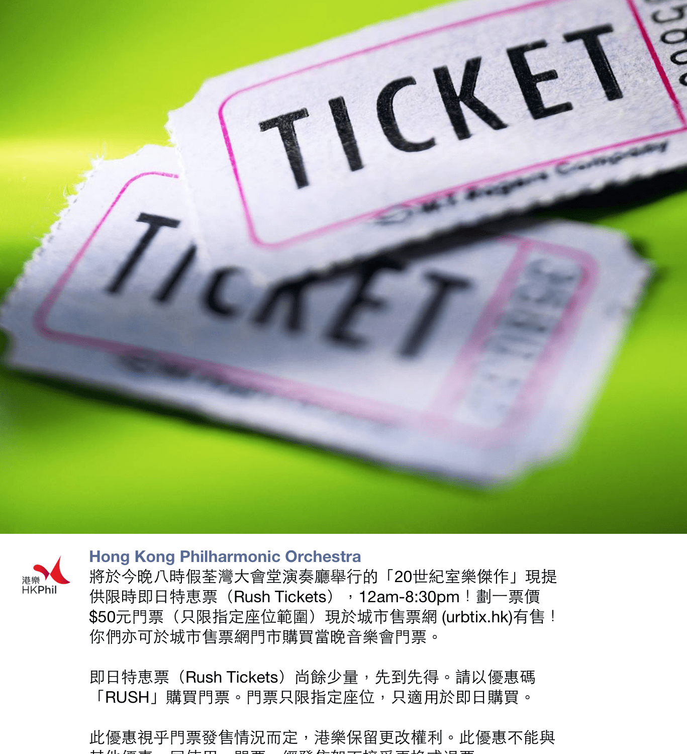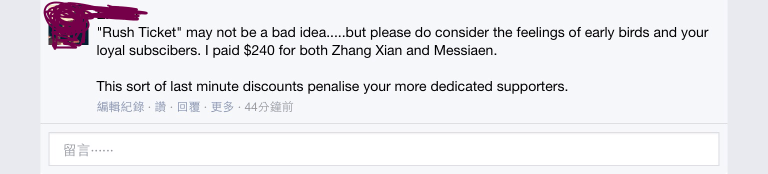即日特惠票理論上是一項可行的促銷方案,我不知道這個月推行之後為港樂帶來多少票房收入與觀眾,但肯定的是,以目前方式在樂季中間推行,有忠實觀眾只為此感到反感。到底那些今天偶而路過給你$50的觀眾重要,還是樂季前已花了鉅款預購門票的觀眾重要?這是港樂市場推廣大員務必認真思考的問題。