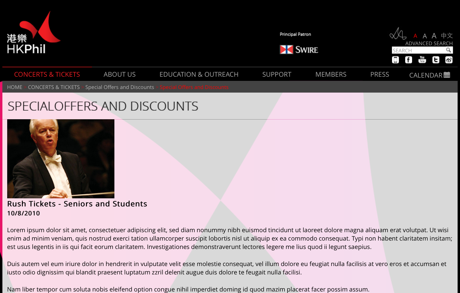 經濟學上有所謂「需求定律」,指價格與需求乃是反比關係,因此減價理論上能夠促銷。香港管弦樂團四月起開始推出即日特惠票(rush tickets),僅在其Facebook粉絲專頁公佈:在其官網搜尋「rush tickets」,只連到這個Lorem ipsum頁面,而搜尋「即日」則沒有結果。