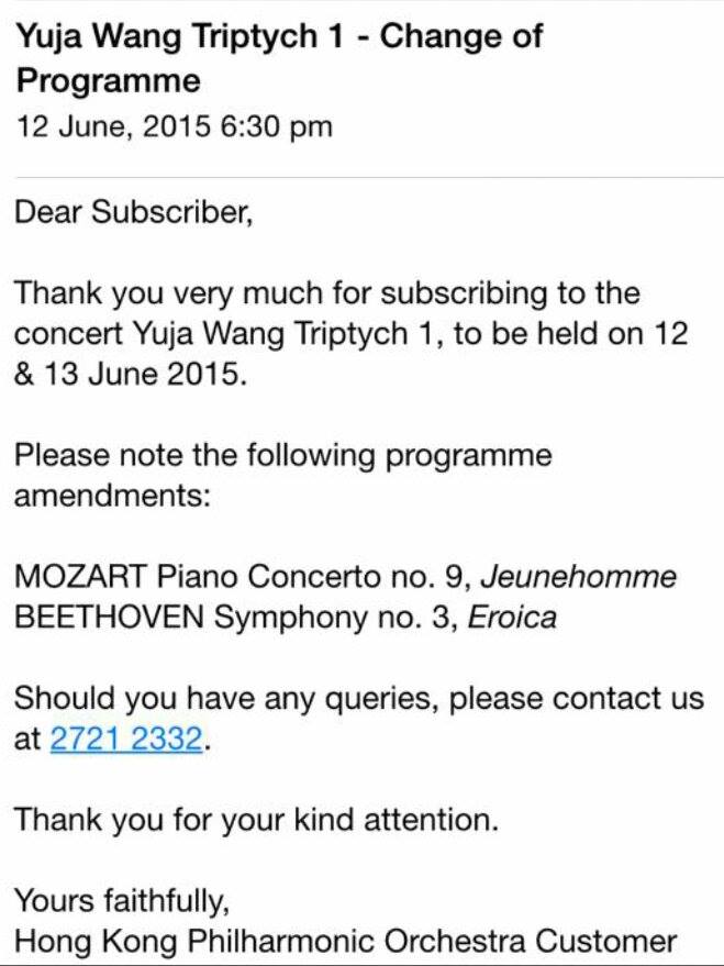 6月12日,下午6:30,首晚音樂會開始前個半小時,差不多一年前訂購了曲目是貝三鋼協及蕭九的《王羽佳|貝多芬》門票訂戶*****終於*****陸續收到港樂電郵通知,音樂會曲目已經更改,並附上查詢方法。