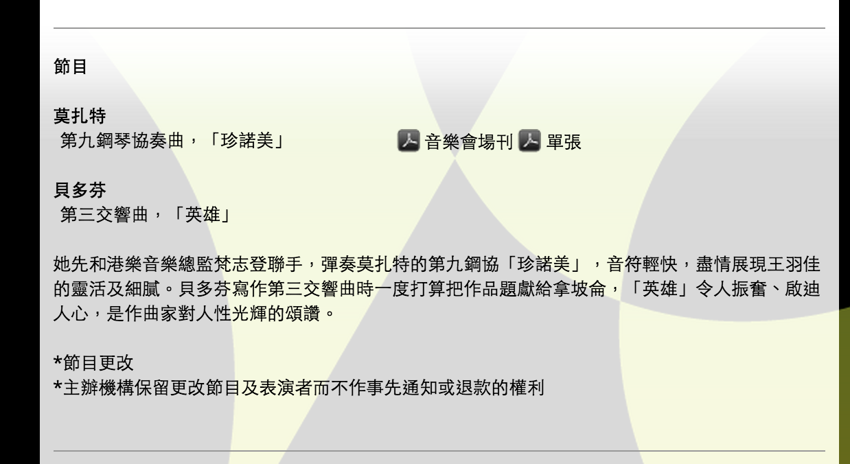 去年9月新樂季開始,所有音樂會資料上載,那時候音樂會名稱仍是《王羽佳|貝多芬》,曲目仍是貝多芬第三鋼琴協奏曲以及蕭斯達高維契的第九交響曲
