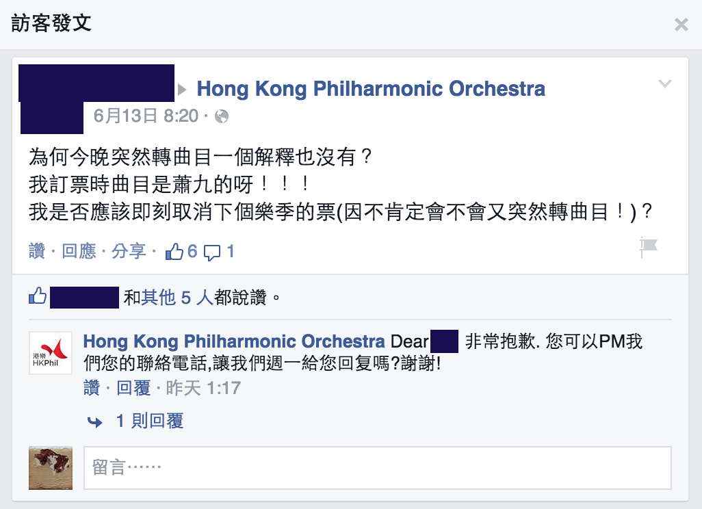 上星期五起,多名樂迷在港樂FB page留言要求樂團解釋曲目異動及「忽然慶回歸」之緣由,另有最少四個港樂自己的貼文引來不同樂迷留言討論相同題目。有失望樂迷說:「When Ashkenazy gave us free concerts a few months ago, you emailed us. When you got sponsors for this concert, you mentioned this in your Facebook post. Why didn’t you do the same for change of programme? You only communicate with your audience selectively? I’m very disappointed at your recent PR strategies!」