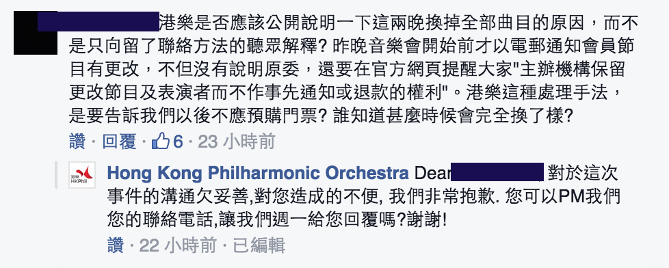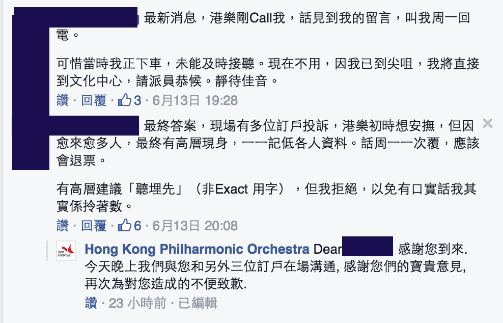 有樂迷也在FB留言說他以私訊留下聯絡方法後接到樂團電話,由於未及接聽只知職員留言請他星期一回電,時維星期六晚上。該樂迷後來到達文化中心,與另外三位觀眾在現場向在場的港樂職員投訴曲目事宜,後有另有一位「高層」(引述該留言)又是請他們留下聯絡方法,又是說星期一會再跟進--