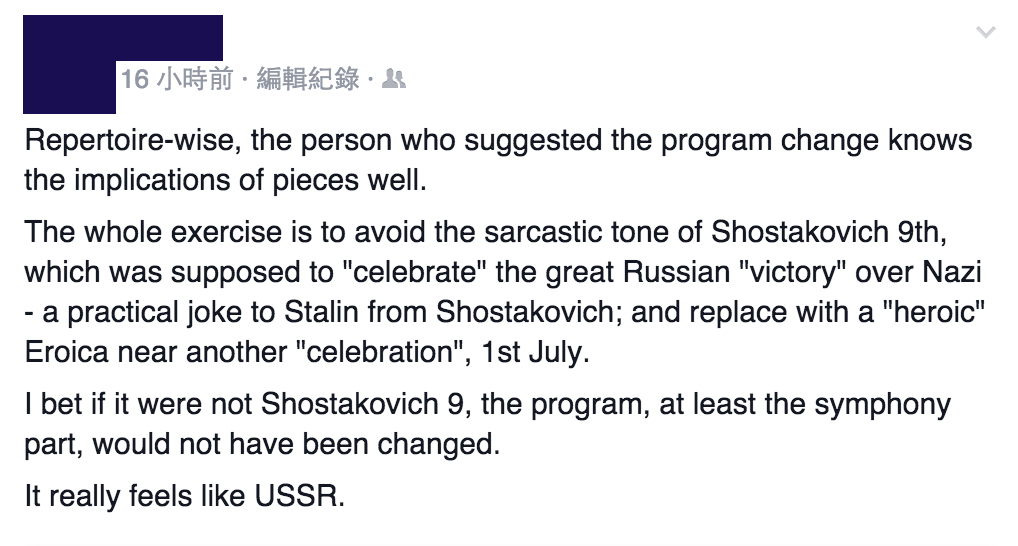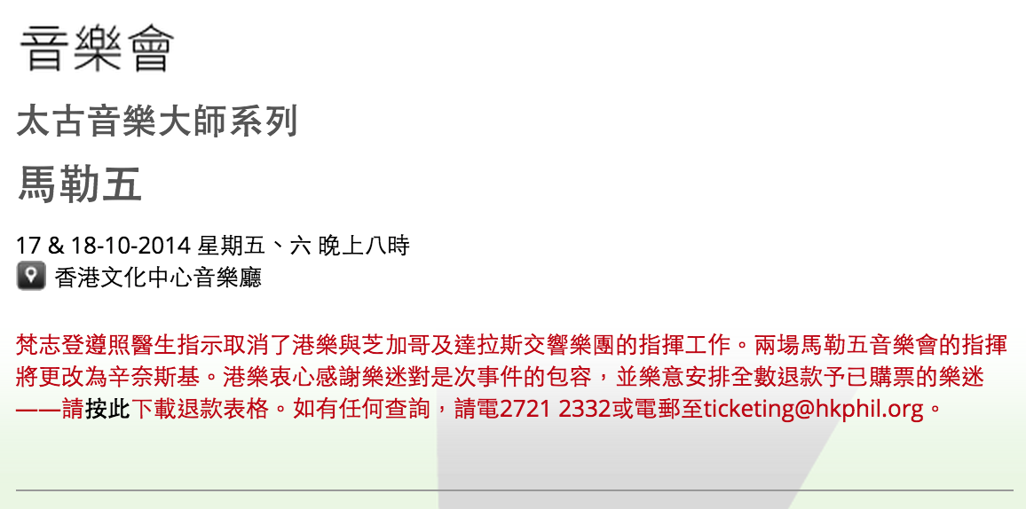 《立場新聞》進一步查詢之下,港樂以電話回應[…] 樂團又強調,過去港樂處理類似情況時,會盡快通知受影響人士。今次節目樂團一直『以為已經通知套票客戶』,直至首演當日下午,收到部分持票者查詢,才懷疑程序有誤未作知會,立即以電郵進行通知,『我們也有考慮過打電話,但需時太久,故沒有選用。』港樂承認今次是『冒失了』,形容情況有如『神推鬼㧬』。