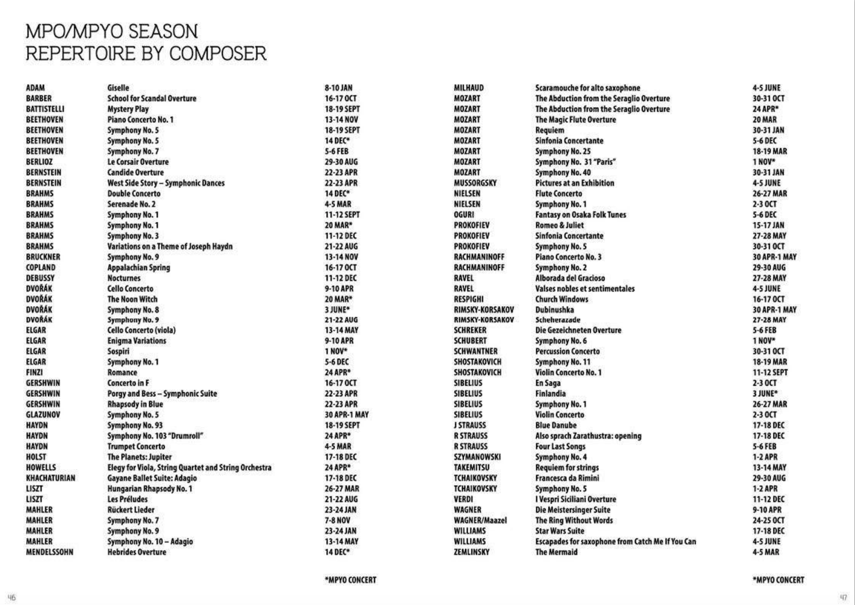 坦白說,MPO的樂季小冊子不好看,所有MPO、MPYO(青年團)、室樂演奏會、獨奏會、甚至部份音樂廳其他節目順序出現,不過排版佈局混亂,看得很辛苦。而且有好幾場音樂會都不見指揮名字(翻查網頁那幾場同樣沒有指揮資料,可能是原訂由Fabio Mechetti指揮?)。不過,某程度上也算是一目了然--你很容易察覺,MPO樂手演奏的室樂演奏會非常多,也有不少獨奏音樂會。