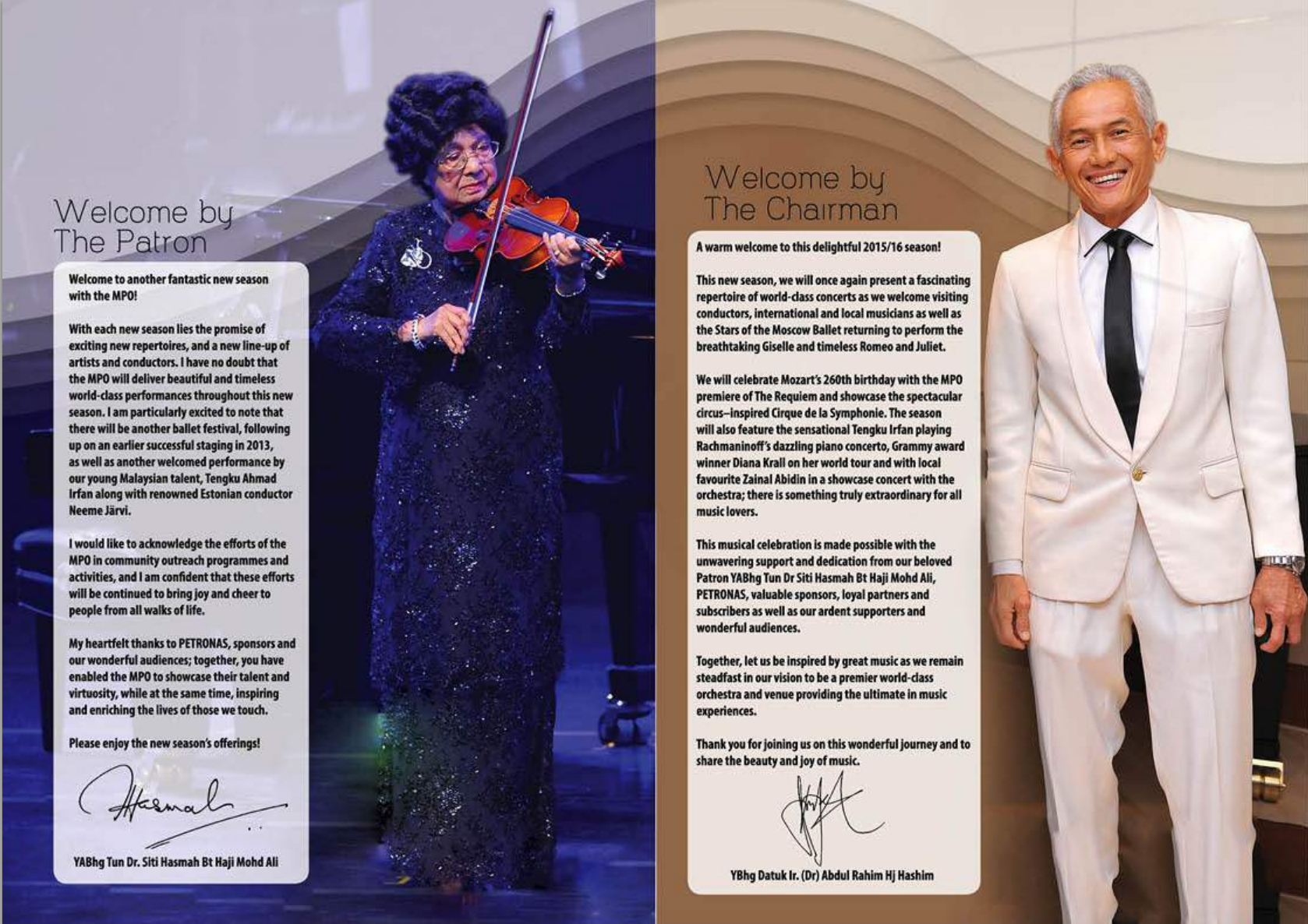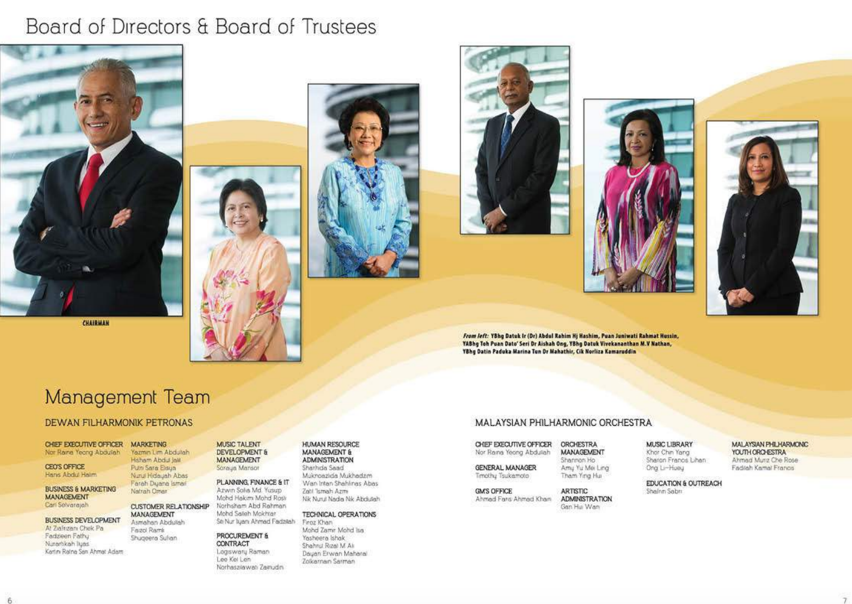 重看小冊子,目錄過後就是首席贊助人(前馬來西亞首相馬哈蒂爾夫人Tun Dr. Siti Hasmah binti Haji Mohamad Ali)及董事局主席(國油出身,現任國油大學校長Datuk Ir. (Dr) Abdul Rahim Hj Hashim)致辭各一版,緊接著是附照片非常醒目的董事與信託人(包括前馬來西亞首相馬哈蒂爾的女兒,還有國油的人),與及音樂廳和樂團的行政成員名單。似乎MPO的權力結構,就是「誰付鈔誰話事」?