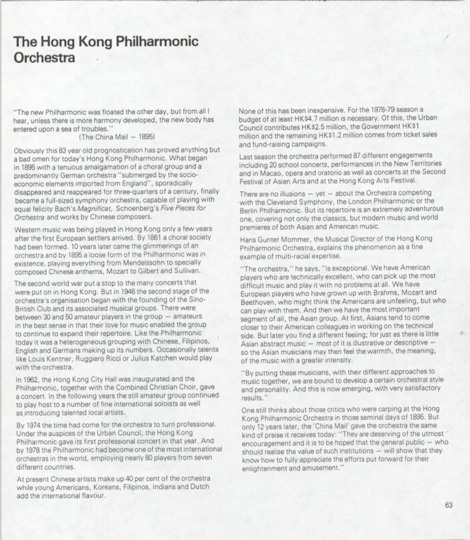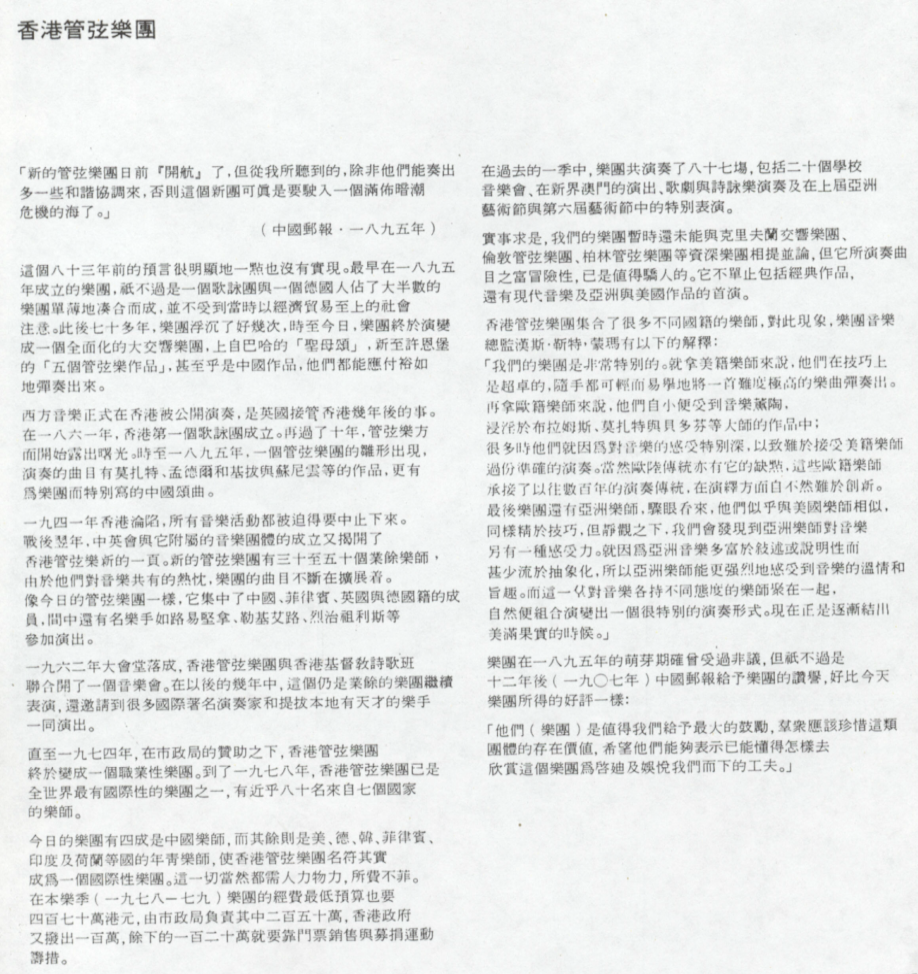 由於港樂之音樂會場刊直至1984年才開始常設樂團簡介,在此之前只能從樂團參與其他藝術節中的演出者簡介一窺其自家史觀之端倪—例如市政局主辦的亞洲藝術節。