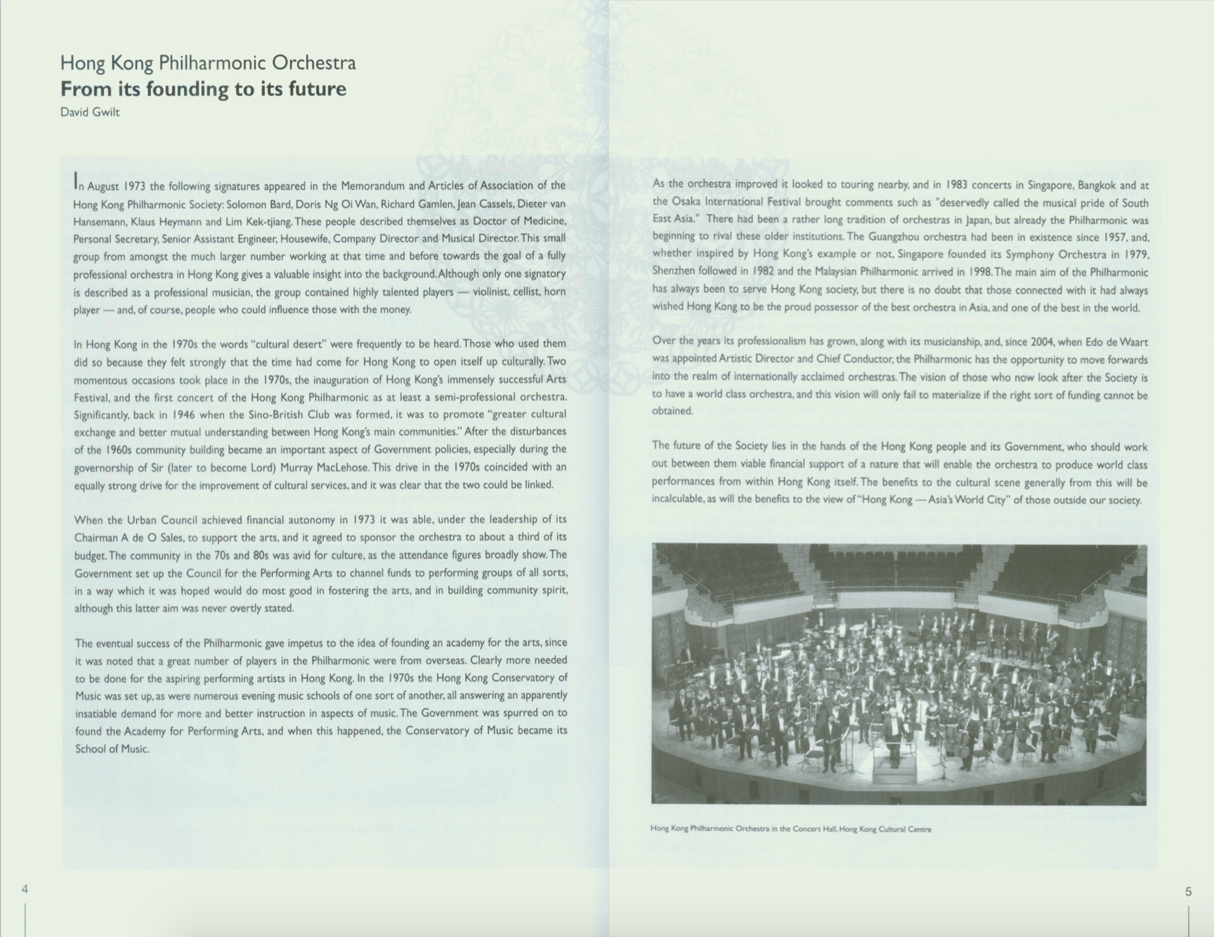 翻過這麼多資料,在千禧年之後的文獻中,筆者見過最中肯最準確的港樂簡史,反而是本業為作曲家的紀大衛教授(Prof. David Gwilt)為2006年《東成西就》音樂會所寫的一篇,謹轉載如下: