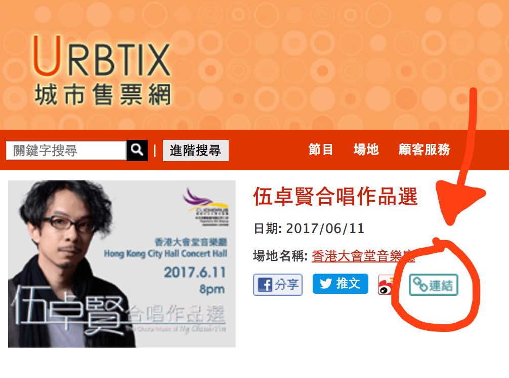 不過,為了代友人購買自己即將舉行的演出門票,5月12日晚上9時39分筆者再次到URBTIX網站,發現了購票頁面已不知不覺多了一個「連結」按扭。
