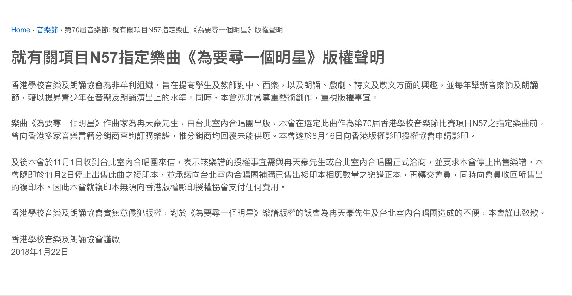 2018年1月22日,香港學校音樂及朗誦節協會(下稱「協會」)就第70屆音樂節項目N57指定樂曲《為要尋一個明星》發表了一則不尋常的聲明: