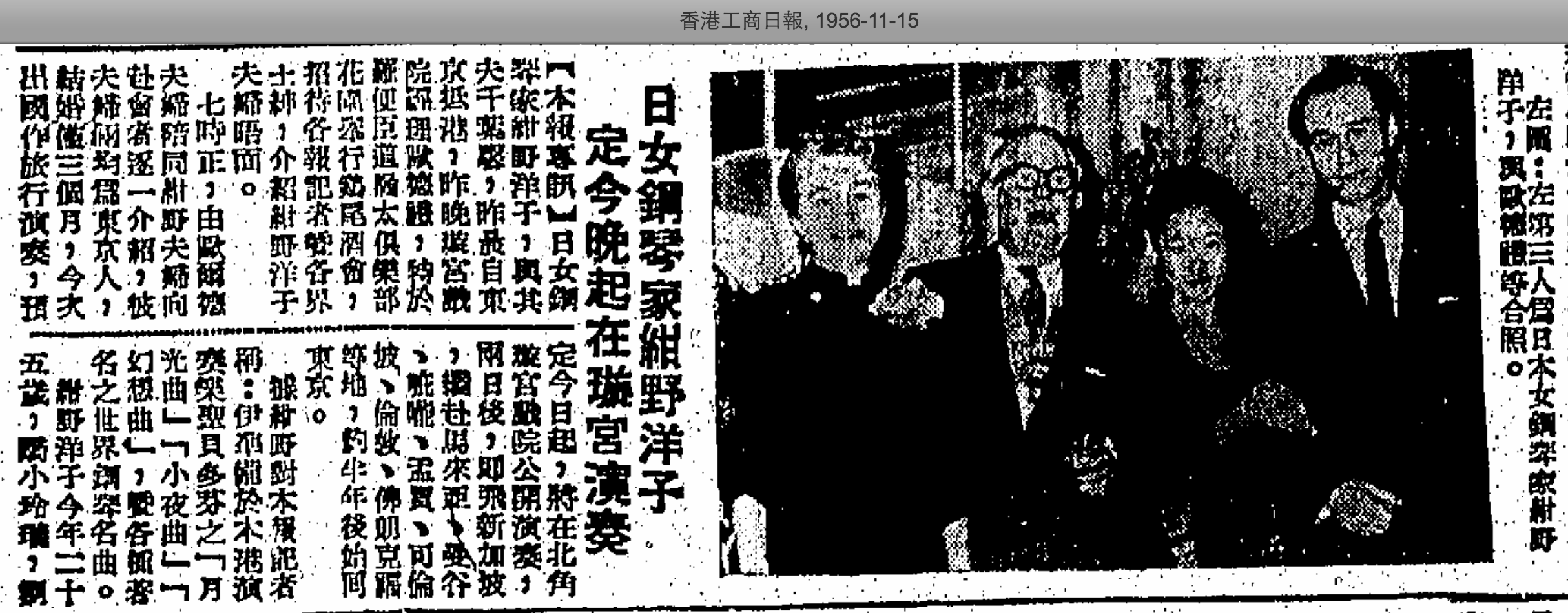 從當時的報道可見,高野耀子是偕同新婚夫婿、圓號演奏家千葉馨(1928-2008)到港。不過二人早就離異,千葉馨後來再娶鋼琴家本莊玲子為妻。